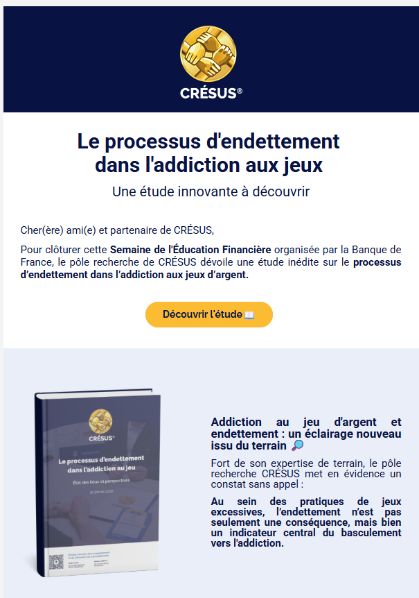 Cette étude est le fruit du pôle recherche de CRÉSUS et met en évidence un constat sans appel : dans le domaine des pratiques de jeux excessives, l’endettement n’est pas seulement une conséquence, mais bien un indicateur central du basculement vers l'addiction.
